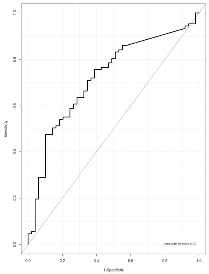 The discriminative power of urinary NATOG concentration to discriminate between active O. volvulus infected and non-infected individuals was found to be low, with an area under the curve (AUC) of 0.721 (95% CI: 0.633–0.797, Figure 2). Furthermore, using the previously proposed cut-off value of 13 µM, 17 individuals were correctly classified as having active infection and 47 individuals were correctly classified as not having active infection, leading to a sensitivity of 15.9% and a specificity of 95.9% (Table 5).