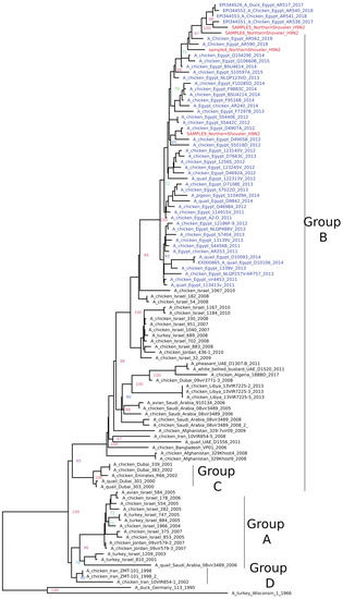 To perform phylogenetic analysis, full HA sequences of H5, H6, and H9 sequences epresenting different genotypes were retrieved from GenBank and GSAID, with special reference to genotypes recently found circulating in Egypt and neighboring countries, and aligned with sequences from the present study. The alignment was performed with Clustal W in MEGA software version 7 [56]. Phylogenetic trees were constructed with the same software using maximum likelihood, with the substitution model general time-reversible with gamma-distribution (GTR+G) and 1000 bootstrap replicates. The trees were viewed using Fig tree V1.4.2 (http://tree.bio.ed.ac.uk/software/figtree/).