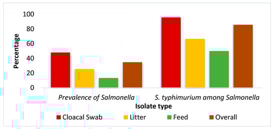 The chicken-adapted Salmonella serovar Gallinarum biovar Pullorum and Gallinarum are responsible for avian salmonellosis, e.g., pullorum disease and fowl typhoid, respectively [6]. In poultry, Salmonellosis is often associated with high mortality up to 90%, thus causing severe economic losses [7]. S. enterica serovar Typhimurium normally colonizes the cecum and is commonly found asymptomatic in cloaca in older chicks [7]. Day old chicks infected with Salmonella may show intestinal pathology and inflammatory responses [8]. Although birds have no obvious disease symptoms, S. enterica serovar Typhimurium can cause systemic metabolic changes in birds affecting production [9]. Human salmonellosis outbreaks are mostly associated with the consumption of poultry products contaminated with S. enterica serovar Typhimurium and S. enteritidis [10]. Therefore, the occurrence of Salmonella, particularly S. enterica serovar Typhimurium, in broiler farms is a public health concern as they can transmit to the food chain.
