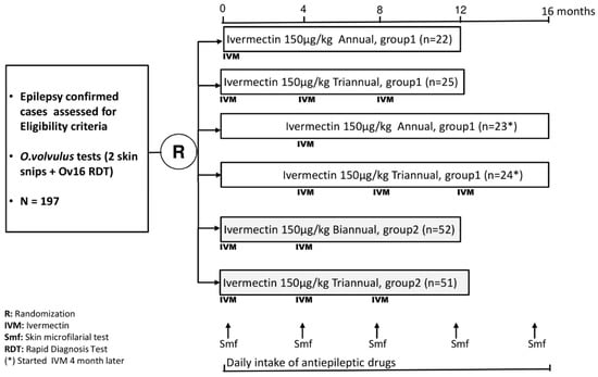- Mandro, M.; Siewe Fodjo, J.N.; Mukendi, D.; Dusabimana, A.; Menon, S.; Haesendonckx, S.; Lokonda, R.; Nakato, S.; Nyisi, F.; Abhafule, G.; et al. Ivermectin as an adjuvant to anti-epileptic treatment in persons with onchocerciasis-associated epilepsy: A randomized proof-of-concept clinical trial. PLoS Negl. Trop. Dis. 2020, 14, e0007966. [Google Scholar] [CrossRef]