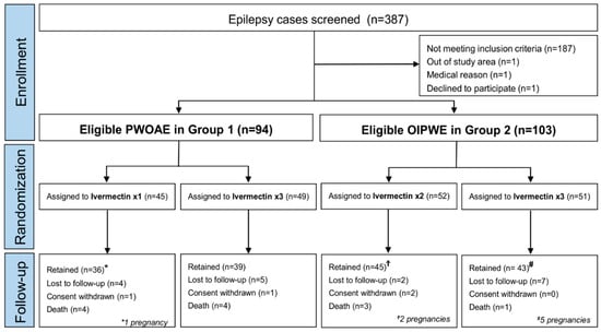 The intent-to-treat population included all 197 randomized participants. Of these, 28 did not take the total number of ivermectin doses as assigned. In group 1, six of the participants assigned to thrice ivermectin were not treated as randomized (four treated once and two treated twice). In the ivermectin thrice arm of group 2, five participants were treated once and seven treated twice, giving a total of twelve not treated as randomized. Moreover, four PWE withdrew their consents, eight died before completing the assigned ivermectin regimen, and seven pregnancies occurred during the follow-up period. Regarding AED treatment, nine participants were switched to another AED, and 65 participants experienced >30 mg dose increase during the follow-up period. Additionally, 73 (37.1%) PWE did not adhere optimally to AED. On an intent-to-treat basis, 43% of participants were seizure-free during the last four months (M9 to M12) of the follow-up period.