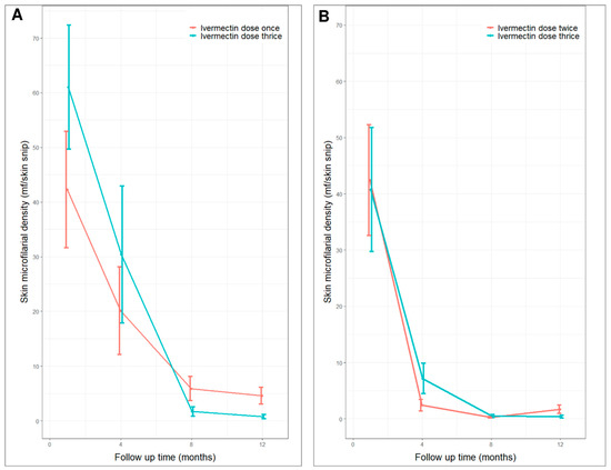 Average skin microfilarial density (with standard error bars) at baseline, month 4, 8 and 12. (A) Group 1 participants (ivermectin thrice vs ivermectin once); (B) Group 2 participants (ivermectin thrice vs ivermectin twice).