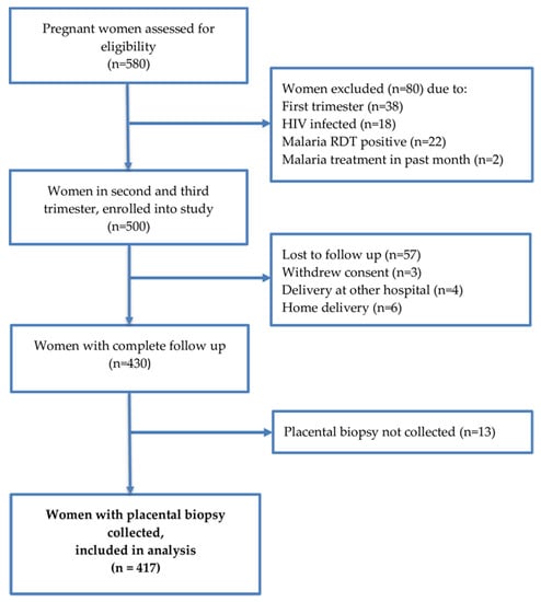 From January 2017 to May 2019, 500 pregnant women were recruited at their first antenatal care (ANC) visit and given monthly IPTp-SP (Figure 1). Enrolled participants were mainly women aged 20–34 years (Table 1). A total of 417 (83.4%) malaria-free women at enrolment were followed throughout pregnancy and had placental biopsies collected at delivery (Figure 1). The women had a median of three (min: one; max: five) ANC visits at which screening of malaria parasites (by microscopy, mRDT and real-time PCR) and determination of hemoglobin concentration were done followed by administration of SP under DOT. About two-thirds (61.4%, 256/417) of the study participants received optimal IPTp-SP doses (more than or equal to three doses), and 38.6% (161/417) received sub-optimal IPTp-SP doses (less than three doses). The newborn mean birth weight with one standard deviation was 2.9 (0.4) kg, and 10.9% (46/423) infants had LBW. Table 1 summarizes the characteristics of study participants at enrollment and during follow up.