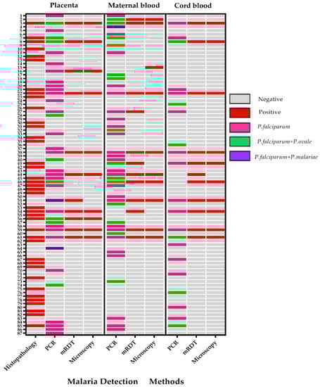 Heat map showing detection of any malaria (n = 87) at delivery in placental tissue; placental blood; maternal peripheral blood; and cord blood using microscopy, mRDT, and real-time PCR. Different malaria species detected by real-time PCR are also shown.