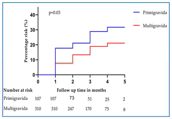 Various potential predictors of asymptomatic malaria detected during pregnancy were assessed. In univariate Cox regression analysis, women who were pregnant for the first time (primigravida) were found to have a significantly higher (66%) risk of having malaria parasitemia during pregnancy compared to those who were pregnant for more than once (multigravida) (Table 3 & Figure 3). In multivariate analysis, the risk of having malaria parasitemia among primigravida has significantly increased to 70% compared to multigravida. At 1 month after initiation of IPTp-SP, the prevalence of parasitemia was significantly higher among primigravida 22 (20.6%) than in multigravida 30 (9.7%), p = 0.003. Age and education level did not significantly affect the risk of malaria parasites detected during pregnancy (Table 3).