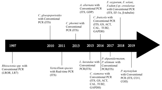 As an important component of the cytoskeleton and spindle microtubules, the highly conserved ß-tubulin gene has been another marker gene for identifying plant fungal pathogens [67]. For example, in 2011, Debode et al. [39] developed a qPCR method to detect several species in Verticillium based on the ß-tubulin gene [39]. Their method allowed the differentiation of the species V. tricorpus, V. dahliae, and V. longisporum in one day. On the other hand, Wang et al. relied on concatenated sequences of ß-tubulin and EF-1α sequences to identify a new sub-species of F. udum f. sp. Crotalariae causing sunn hemp Fusarium wilt in Taiwan [42].