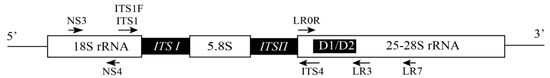 A schematic representation of the fungal ribosomal RNA gene cluster showing the locations of individual DNA fragments and the common primers used for PCR amplification. Adapted from White et al. (1990) and Adam et al. (2017).