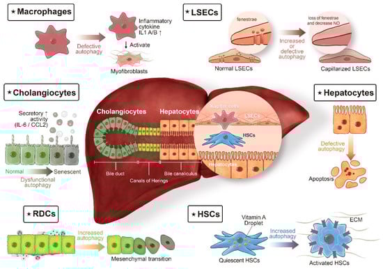 We outline the roles of autophagy in various cells involved in fibrogenesis, including HSCs, RDCs, hepatocytes, cholangiocytes, macrophages, and LSECs.