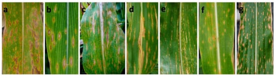 Typical symptoms of Bipolaris leaf spot of maize in the field. (a,b): Type I symptoms included fusiform or elliptical lesions; (c,d): Type II symptoms were characterized by elongated, nearly long strip lesions restricted by veins; (e): Type III symptoms were long, narrow linear lesions; (f): Type IV symptoms were nearly circular lesions that were smaller than the Type I lesions; (g): Type V symptoms were punctiform or minute necrotic lesions.