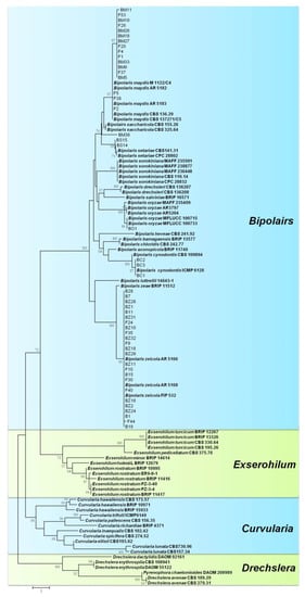 - Hernández-Restrepo, M.; Madrid, H.; Tan, Y.P.; da Cunha, K.C.; Gené, J.; Guarro, J.; Crous, P.W. Multi-locus phylogeny and taxonomy of Exserohilum. Persoonia 2018, 41, 71–108. [Google Scholar] [CrossRef]