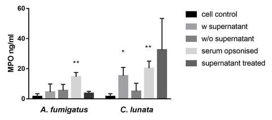The culture supernatant of C. lunata with the hyphae and the serum opsonized hyphae induced the myeloperoxidase (MPO) release of the neutrophils (Figure 1). If the culture supernatant was changed to modified Krebs-Ringer phosphate glucose (mKRPG) buffer over the hyphae, MPO release did not increase compared to the untreated neutrophils. Presence of the A. fumigatus hyphae induced significant MPO release only after serum opsonization, while the culture supernatant of the germinated conidia could not activate the neutrophils.