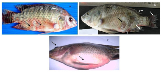 Naturally infected O. niloticus with Aeromonas hydrophila complex; (A) fish showing skin darkness (*), detached scales (white arrow), and external scattered hemorrhagic patches (black arrows); (B) fish showing ulcerative necrosis (black arrows), fin erosions (white arrows), and inflamed vent (#); (C) fish showing exophthalmia and abdominal distension (black arrows).