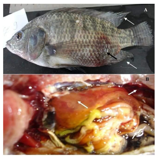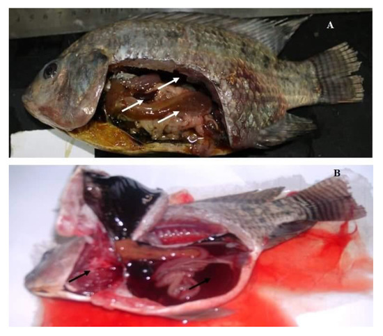 Naturally infected O. niloticus with Aeromonas hydrophila complex; (A) fish showing enlarged liver, engorged spleen, and congested kidney (white arrows); (B) fish showing sero-hemorrhagic fluids in the abdominal cavity and congested friable gills (Black arrows).