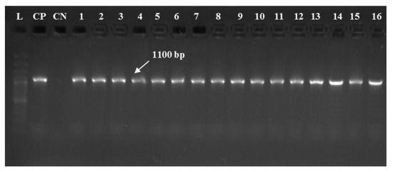 Electrophoretic pattern of gyrB gene of A. hydrophila complex using specific set of primer described elsewhere by Yanez et al. (2003). Lane marked L refer to 100 bp DNA ladder. CP is a control positive (A. hydrophila strain, kindly supplied by Animal Health Research Institute in Dokki, Cairo). CN is a negative control (DNA free template). Lanes 1–16, the specific DNA product amplified from the representative retrieved isolates of O. niloticus with expected amplicons size of 1100 bp.