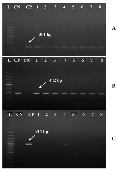 Electrophoretic pattern of aerA (A), alt (B), and ahp (C) virulent genes of A. hydrophila complex using specific sets of primers described elsewhere by Li, Ni, Liu and Lu [29]. Lanes marked L refer to 100 bp DNA ladder. CP is a control positive (A. hydrophila strain, kindly supplied by Animal Health Research Institute in Dokki, Cairo). CN is a negative control (DNA free template). Lanes 1–8, the specific DNA products amplified from the representative retrieved isolates of O. niloticus with expected amplicons size of 301, 442, and 911 bp, respectively.