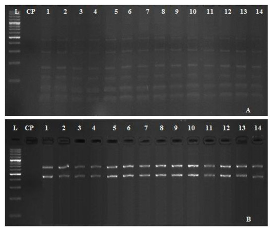 Indeed, several studies related to A. hydrophila revealed variability and high genetic diversity among different strains according to their ecological distribution [49]. Therefore, the RFLP-PCR technique was performed to evaluate the genetic variability or homogeneity among representative 14 isolates of A. hydrophila, retrieved from seven tilapia farms in different geographical areas. RFLP analysis is an extremely useful and simplified technology that distinguishes between the most relevant and antigenically related organisms including bacteria [23]. All retrieved strains have no genetic diversity and showed dark staircase patterns of bands with identical profiles (Figure 5). The genetic stability among different strains may attribute to the short distance between the sampling points and reflect their physiological adaptation to the environments in which they exist [50].