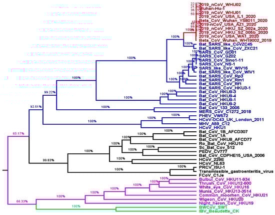 Evolutionary phylogenetic tree analysis of Coronaviruses: whole-genome sequences based on the phylogenetic tree of CoVs was constructed with the maximum-likelihood method using BEAST with GTR+I+G as the nucleotide substitution model with an applied posterior probability value of 0.5. Branches with different colors represent different genera of Coronaviruses; black, alpha coronavirus, blue, beta coronavirus; red, SARS-CoV-2; green, delta coronavirus; purple, gamma coronavirus.