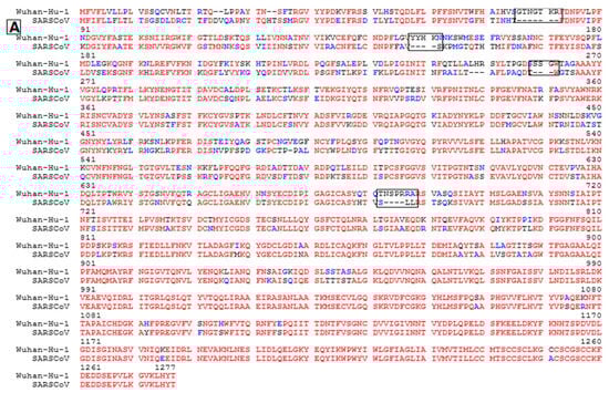 Usually viruses adopt different strategies including recombination, mutation and reassortment which facilitate the viruses in getting to equilibrium in the final host. Due to low fidelity of reverse transcriptase and RNA-dependent RNA polymerase, RNA viruses are more vulnerable to point mutations even though the point mutation rates in RNA viruses are approximately 10−4 to 10−5 []. During the 2002 SARS-CoV epidemics, three mutations per RNA in each replication round were estimated (8.26 × 10−6 per nucleotide per day) []. Often, large population size and high rate of mutations in RNA viruses rapidly adjust genotypes allowing for quick adaptations in a rapidly changing environment. Respectively, mutations have a specific influence on virus reproductive fitness as positive selection drives to fix the positive fitness effects of beneficial alleles, while negative selection removes lethal and deleterious alleles from a population. Together with these selective approaches, the evolutionary routes of virus populations can be figured out across a sequence space []. Examining the genetic insight of SARS and Wuhan-Hu-1-CoV presented more than 90% sequence conservation between the E, M and N protein with few numbers of point mutations (Table 1), whereas the higher rate of mutations in the S protein of Wuhan-Hu-1-CoV were also observed and shared ~81% identity (Table 1, Figure 4A). These results were in accordance with the results of Xu et al. and Pradhan et al. [,].