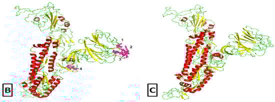 SARS-CoV used a receptor-binding domain that stretched between 306–527 amino acid sequences. We compared the receptor-binding domain of SARS-CoV and Wuhan-Hu-1-CoV and we found that 73% of conserved amino acid regions were observed in Wuhan-Hu-1-CoV (Figure S5). In the meantime, similar conservation patterns of the amino acid were also found in the binding receptor motif extended 424–494 amino acid residues used by SARS-CoV to bind human ACE2 (Figure S6). It was suggested that a significant affinity of Wuhan-Hu-1-CoV with ACE2 imposed high public health risk for humans by transmission through the S protein-ACE2 binding channel. Subsequently, homology protein modeling was used to predict the S protein structure of Wuhan-Hu-1-CoV via the structure of SARS-CoV spike glycoprotein (PDB: c5xlrC) (Figure 4b,c).