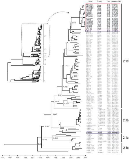 Phylogenetic analysis of the complete E2 gene sequence of 16 CSFV strains isolated from Korean wild boars (2017–2019). Complete E2 gene sequences (n = 197) were obtained from the NCBI GenBank database. Each dataset was simulated by using the following options: generation = 100,000,000; burn-in, 10%; and ESSs > 200. The confidence of the phylogenetic analysis-based timescale by factor (1.0) is represented by the numbers above the nodes representing branch length (time). Eighteen CSFV strains isolated from Korean wild boars (2011–2019) and two CSFV strains isolated from domestic pigs (2003 and 2016) are marked by red and blue boxes, respectively.