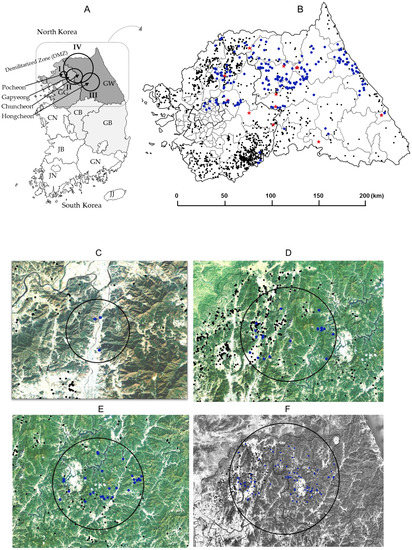 Space–time cluster analysis of CSF antibody-positive cases and antibody titers in wild boars. Positions of four clusters on the Korea map (A). Positions of pig farms (dark dot) and of CSF antibody (blue dot) and CSF antigen (red star) from captured wild boars between 2016 and 2019 (B). Space–time cluster analysis of CSF sero-positive wild boars was conducted, using SaTScan software (version 9.6), with the minimum time aggregation set as one month. Three clusters are marked with black circles (C: cluster I, D: cluster II, and E: cluster III). Space–time cluster analysis of CSF antibody titers was conducted by using data from the cluster IV marked with a black circle (F). Images (C,D, E,F) are marked dark dot (pig farm) and blue dot (CSF sero-positive wild boar). The nine regions (A) were as follows: GW: Gangwon; GG: Gyeonggi; GN: Gyeongnam; GB, Gyeongbu; JN: Jennam; JB: Jenbuk; CN: Chungnam; CB: Chungbuk; and JJ: Jeju.