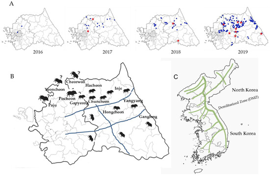 Predicted movements of CSFV-infected wild boars. Sites of capture of CSF antigen- and antibody-positive wild boars by year (2016–2019) are marked by a red star and blue circle, respectively (A). Expected routes and highways are marked by wild-boar pictures and blue lines (B). On the map of Korea, consecutive high mountains are marked by green lines (C).
