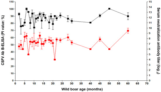 Relationship between CSF sero-positive and wild-boar age. CSFV antibodies were measured by PI value (≥ 40% positive and < 40% negative), using the CSFV Ab B-ELISA (black line) and titers (log2), using the serum neutralization antibody test (red line). Data are expressed as the mean ± SD (standard deviation).