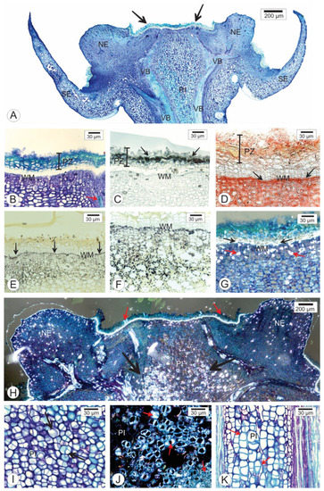Longitudinal sections of the receptacle of Citrus sinensis cv. Valencia showing symptoms of persistent calyx caused by Colletotrichum acutatum infection (A). Overview of the injured receptacle. Note the wound meristem that underlies the area where the ovary was previously located (arrows). (B–D). Details of the protective layer (PL). (C). Lipid compounds revealed by Sudan black B in the cell layers produced by the meristem (arrows). (D). Xylidine Ponceau test indicating the accumulation of protein compounds (arrows) in meristematic cells. (E,F). Positive reaction for iodinated zinc chloride, indicating that starch accumulates beneath the entire length of the wound meristem (arrows). (G,H,J). Analysis of sections under polarized light. (G). Deposition of crystals between cells (red arrows). (H). Cellulose thickening of the pith cell walls (larger arrows). (I). Detail of pith with cells that have undergone hypertroph and have thick walls (arrows). (J). Note the presence of crystals (arrows). (K). Hypertroph pith cells with thick walls (arrows). NE—nectary; PI—pith; WM—wound meristem; VB—vascular bundle.