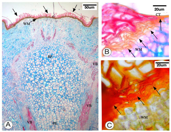 Longitudinal sections of the peduncle and receptacle of persistent calyx in Citrus sinensis cv. Valencia caused by Colletotrichum acutatum infection. (A–B). Staining method using Alcian blue safranin O, and Sudan IV. It is possible to observe lignified cell walls (arrows in (A)) and cells with suberized walls (arrows in (B)) above the wound meristem. (C). Details of the wound meristem and the cells with thick walls stained with Sudan IV. Strong staining was observed in the cells (arrows). CT— cuticle; PE—peduncle; WM—wound meristem; VB—vascular bundle.