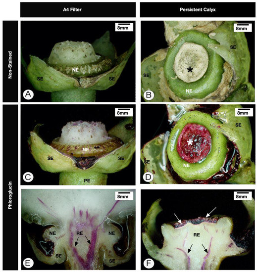 Digital microscopy analysis of Citrus sinensis cv. Valencia healthy calyxes and persistent calyxes caused by Colletotrichum acutatum infection. (A,C). The young fruit was removed at the top of the receptacle. (A,B). Nonstained tissues. (C–F). Phloroglucin-stained tissues (pink). (E,F) Longitudinal section. Note that the region where the ovary was inserted has cells with lignified walls (* in B,D). Black arrows in (E,F) indicate the vascular bundle. The white arrows in (F) indicate the protective layer. NE—nectary; PE—peduncle; RE—receptacle; SE—sepals.