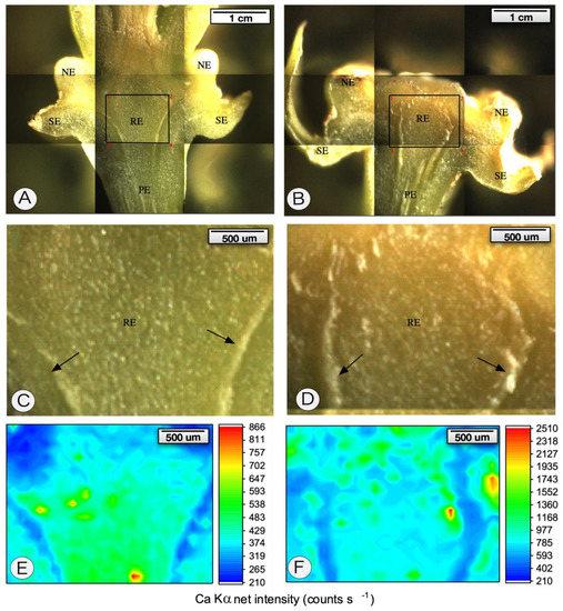 X-ray fluorescence spectroscopy of Citrus sinensis cv. Valencia healthy calyxes (A,C,E) and persistent calyxes caused by Colletotrichum acutatum infection (B,D,F). The receptacles and peduncles were harvested and longitudinally sectioned. (A–D). Light microscopy images (63×). (E,F). X-ray fluorescence microanalysis. Note the high levels of calcium in the persistent calyx. Arrows in (C,D) indicate the vascular bundle. NE—nectary; PE—peduncle; RE—receptacle; SE—sepals.