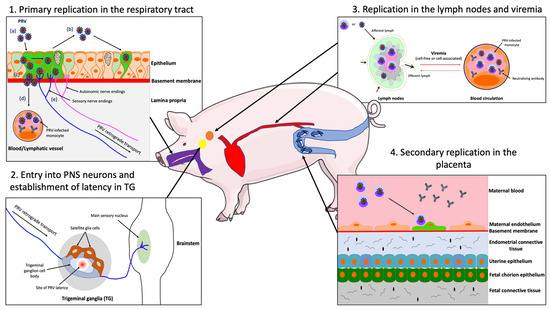 Following replication in the swine respiratory epithelium, PRV may cross the basement membrane (BM) in foci to penetrate the connective tissues and reach the draining lymph nodes and bloodstream [56,72] (Figure 1(1c,d)). The invasion of PRV through the BM towards the lamina propria is mediated by trypsin-like serine protease activity [73]. Within 24–48 hpi, infectious virus as well as viral antigens can be detected in swine inguinal lymph nodes [74,75,76]. Virus can persist in pharyngeal lymph nodes for up to 35 days [77]. PRV infection is amplified in the draining lymph nodes with discharge of infected leukocytes, via the efferent lymph, into the blood circulation. As a result, PRV initiates a cell-associated viremia in peripheral blood mononuclear cells of swine (mainly monocytes) that facilitates dissemination within the host (Figure 1(3)). Cell-free viremia can also occur in infected pigs [78,79]. Viremia can be detected after 1 dpi and persists for 2 weeks. The cell-associated viremia is a prerequisite for the dissemination of PRV to the pregnant uterus.