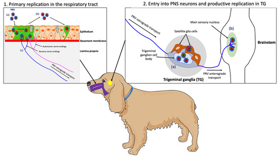 Schematic representation of the pathogenesis of PRV in a non-natural host, the dog. (1) PRV first replicates in the epithelium of the URT; (a) PRV infection; (b) viral spread within the respiratory epithelium and viral shedding; (c) PRV enters nerve endings of the PNS, including those coming from the TG and spreads in the retrograde direction to the ganglia. (2) PRV initiates a productive infection in TG neurons; (a) PRV replicates in cell bodies of TG neurons; (b) New progeny virions can further spread in the anterograde direction and infect the CNS (brainstem). Purple = respiratory tract; yellow = TG.