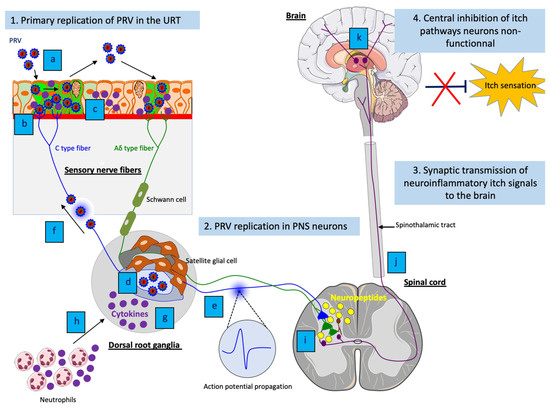 Model of PRV-induced neuropathic itch in non-natural hosts. (1) (a) Efficient viral replication and spread of PRV in the respiratory epithelium; (b) PRV particles activate axons terminals of sensory PNS neurons; (c) Activated sensory PNS neurons trigger inflammatory signaling pathways and produce pro-inflammatory cytokines that are released in PNS neurons and locally at axon terminals. (2) (d) Efficient PRV replication in cell bodies of PNS neurons and release of new progeny virions; (e) Spontaneous hyperexcitability of neurons and increase of action potential firing as well as (f) reseeding of new progeny virions back to the epithelium increases electrical coupling of axons and contributes to the pruritus; (b) Amplification of the inflammatory response in PNS neurons; (h) The production of pro-inflammatory cytokines in PNS neurons attract neutrophils and other immune cells to the site of infection and propagate the neuroinflammation. (3) (i) Release of neuropeptides from activated PNS neurons stimulate excitative interneurons in the dorsal horn of the spinal cord; (j) The excitation spreads to spinothalamic tract neurons, which in turn send neuroinflammatory itch signals to the brain; (k) These signals are relayed and processed in the somatosensory cortex. (4) The central itch inhibition pathways are likely dampened or disabled, resulting in an unstoppable pruritus.