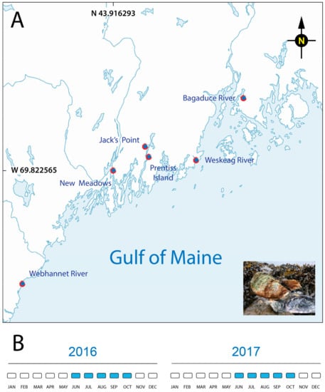 - Fernández Robledo, J.A.; Marquis, N.D.; Countway, P.D.; Record, N.R.; Irish, E.L.; Schuldt, M.M.; Kingston, S.E.; Bishop, T.J.; Messerman, N.A.; Bowden, T.J. Pathogens of marine bivalves in Maine (USA): A historical perspective. Aquaculture 2018, 493, 9–17. [Google Scholar] [CrossRef]