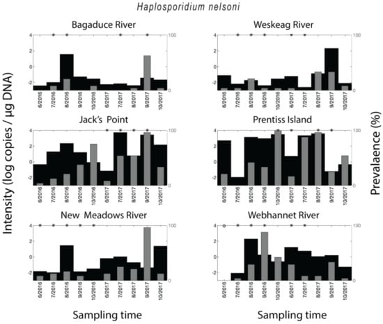 Spatial–temporal patterns for Haplosporidium nelsoni. Parasite density and parasite qPCR-prevalence. * indicates a statistically significant (p < 0.05) difference in parasite density when comparing two neighboring time points.