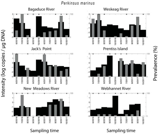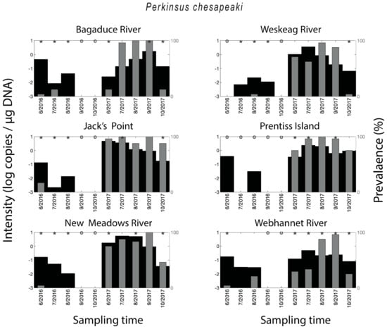 Spatial–temporal patterns for Perkinsus chesapeaki. Parasite density and parasite qPCR-prevalence. * indicates a statistically significant (p < 0.05) difference in parasite density when comparing two neighboring time points.