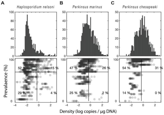 Distribution of prevalence versus intensity for the sampled sites. (A) Haplosporidium nelsoni (B) Perkinsus marinus. (C) Perkinsus chesapeaki. Upper panel shows a histogram of parasite density (log scale). Lower panel shows a scatter plot of infection intensity versus infection prevalence (percentage of oysters infected at a given site/time). The numbers indicate the percentage of points that fall within each quadrant.