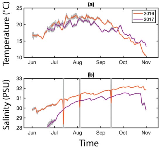 Environmental parameters for the Damariscotta River Estuary (DRE). An array of LOBO buoys are deployed along the coast of Maine as part of the University of Maine’s SEANET project. One of these buoys was located near the Prentiss Island site from 2015–2018, collecting hourly temperature (°C, (a)) and salinity (PSU, (b)) data. Data are averaged daily; gray shading indicates daily variance.