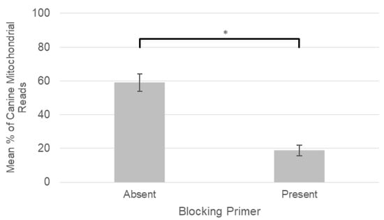 Analysis of the mean percentage of canine mitochondrial reads relative to total reads on a per sample basis was 59% (±5.1%) for samples amplified without the blocking primer compared to 19% (±3.1%) with the primer (Figure 1). The difference between these two groups was statistically significant at the p < 0.01 level, indicating that our blocking primer significantly reduced the amount of canine mitochondrial reads amplified. Mean blocking efficiency across our canine DNA samples was 25% (±3.0%) according to the formula defined by Tan and Liu (2018) [], with individual sample blocking efficiencies ranging from as low as 2.2% in some samples with low total sequence counts to as high as 100% blocking efficiency in others.