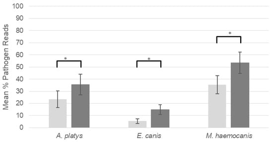Mean percentage of three different pathogen reads across all pathogen positive samples in the absence of the blocking primer (light grey) and with the blocking primer (dark grey). Vertical error bars display standard error and horizontal bars highlight differences that are significant at the p < 0.01 level (*).