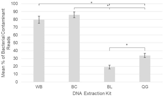 The amount of artificial kit-derived contaminant DNA detected by our NGS methodology differed significantly depending on the extraction kit used (Figure 3). Both automated extraction kits had a significantly higher percentage of bacterial contaminant DNA (BC 86% and WB 80% of total reads) compared to 34% of reads for QG and 19% for BL. All differences between kits were significant at the p < 0.05 level apart from the mean contaminant reads between the two automated kits; WB and BC.