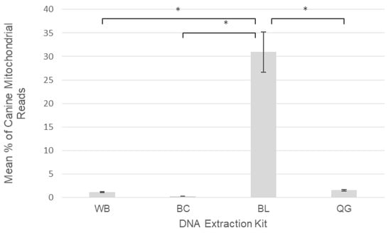 Mean percentages of canine mitochondrial reads relative to total reads across four different DNA extraction kits: Promega Whole Blood (WB), Promega Buffy Coat (BC), Bioline Whole Blood (BL), Qiagen Whole Blood (QG). Vertical bars display standard error and asterisks show differences between kit types that are significant at the p < 0.05 level (*).
