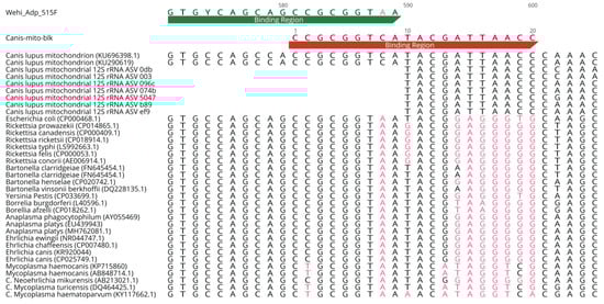 Prior research employing NGS metabarcoding analysis of bacterial pathogens from canines suffered from issues of bacterial primer cross-reactivity with the canine mitochondrial 12S ribosomal RNA (12S rRNA) gene []. On average, 47% of total reads during previous experiments were from mitochondrial DNA (mtDNA) cross-reactivity despite poor complementarity between the bacterial primers and 12S rRNA gene sequences []. This cross-reactivity is likely due to multiple causes, including a dominance of canine host DNA in the blood [] in conjunction with the prokaryotic origin of mitochondria producing sequence similarities [].