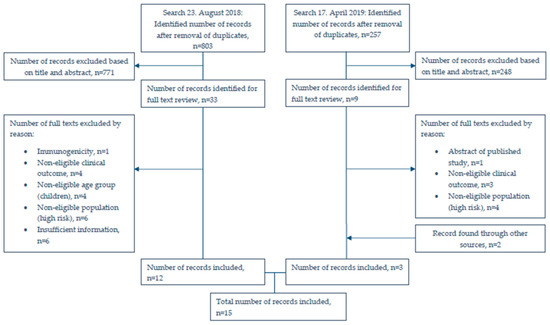 The main limitation of this review is the short time span of the systematic search. The low number of new publications did not permit meta-analyses stratified by vaccine, study design and outcome. However, our results can be used in conjunction with earlier studies not included in this review [2,3,4,5,6,7] (Table S1). Another limitation is the inconsistent use of age groups across studies, making it difficult to compare VE by age.