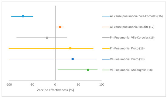 The VE in observational studies on PCV13 ranges from a negative VE (adjusted VE −69%) against all-cause pneumonia to a high protective VE of 71% against VT-CAP. All of these studies were conducted in the period 2014 to 2016, and in regions where PCV13 is a part of the routine childhood immunization schedule.