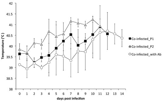 Body temperatures of pigs co-inoculated with classical swine fever viruses of two genotypes. Pigs in the group co-infected_P1 (square) were inoculated with TD/96 strain (genotype 2.1) and 94.4 strain (genotype 3.4). Pigs in the group co-infected_P2 (triangle) were inoculated with whole blood taken from a pig of group co-infected_P1 at 12 days post-infection. Pigs in the group co-infected with Ab (circle) were born from a sow vaccinated with LPC vaccine and were inoculated with the two virus strains. Each point represents the mean and standard deviation of the three pigs in the same group.