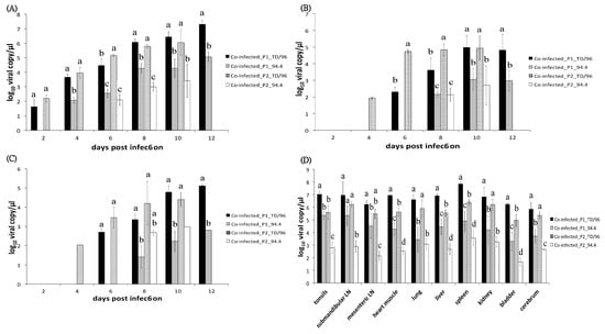 Comparison of viral loads of co-infected_P1 (Group 1) and co-infected_P2 pigs (Group 2). Viral loads in (A) blood, (B) oral swabs, (C) fecal swabs, and (D) organs of co-infected_P1 and co-infected_P2 pigs were quantified by reverse transcription multiplex real-time polymerase chain reaction. The data represent the mean and standard deviation from three pigs. Values with different superscript letters, a–d, among the four groups of samples at the same dpi (A–C) or the same organ (D) indicate a statistically significant difference (p < 0.05) from each other. The superscript letter “a” indicates the highest viral load and “d” indicates the lowest viral load among the compared groups, while “ab” indicates a viral load in between categories “a” and “b”. No significant differences exist between values containing the same letter. The absence of a superscript letter indicates no statistical analysis due to only one sample of a group or only one group within the same dpi.