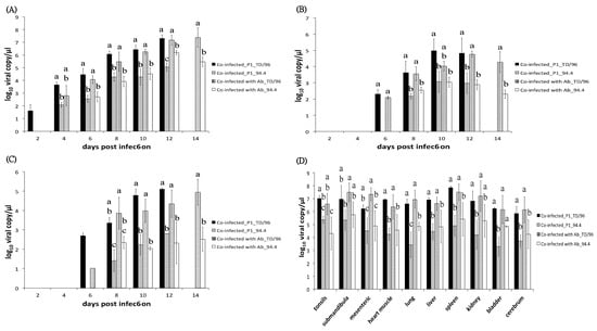 Comparison of viral loads of co-infected_P1 (Group 1) and co-infected with Ab pigs (Group 3). Viral loads in (A) blood, (B) oral swabs, (C) fecal swabs, and (D) organs of co-infected_P1 and co-infected with Ab pigs were quantified by reverse transcription multiplex real-time polymerase chain reaction. The data represent the mean and standard deviation from three pigs. Values with different superscript letters, a–d, among the four groups of samples at the same dpi (A–C) or the same organ (D) indicate a statistically significant difference (p < 0.05) from each other. The superscript letter “a” indicates the highest viral load and “d” indicates the lowest viral load among the compared groups, while “ab” indicates a viral load in between categories “a” and “b”. No significant differences exist between values containing the same letter. The absence of a superscript letter labeled indicates no statistical analysis due to only one sample of a group or only one group within the same dpi.