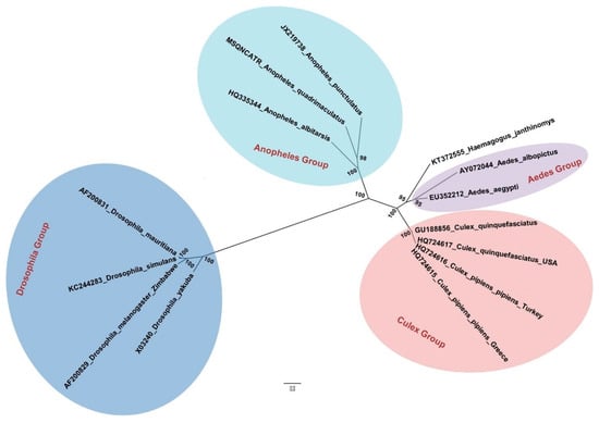 Phylogenetic tree built by the method of maximumlLikelihood, from sequences of mitochondrial genes COX1, COX2, NAD4, NAD5 and CYOB of Haemagogus janthinomys and other species of Diptera, from da Silva Lemos et al. 2017 [25]. The bootstrap values are represented in each node.